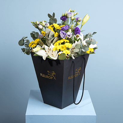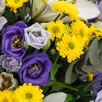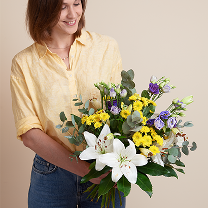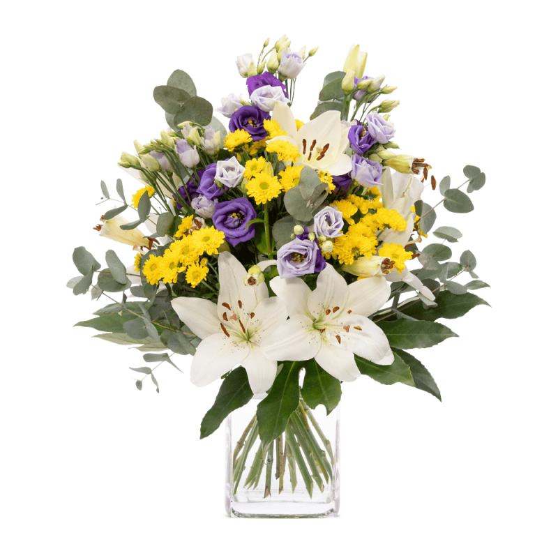 Dieser fröhlich, prächtige Blumengruß macht einfach gute Laune! Rund gebundener Strauß in Weiß-Gelb-Lila mit Lilien, Eustoma und Santini. Als Beiwerk werden Aralie und Eukalyptus verwendet