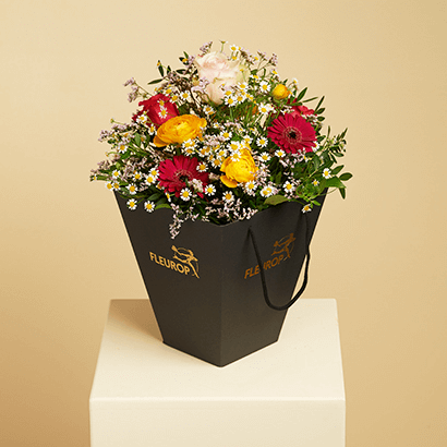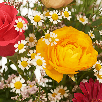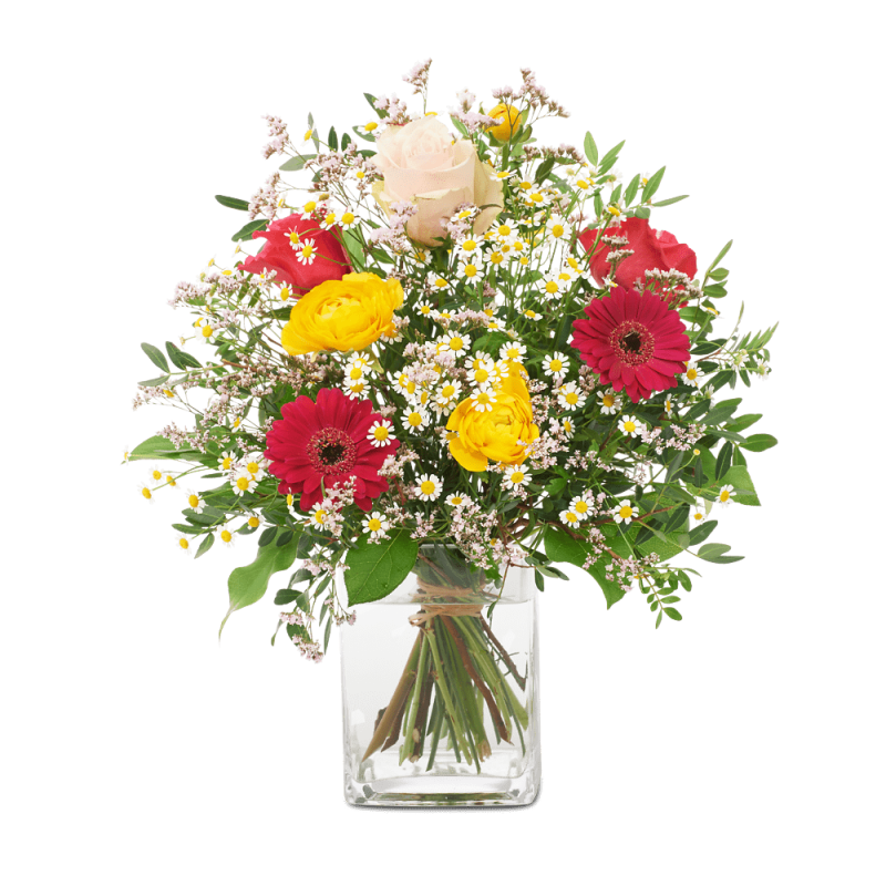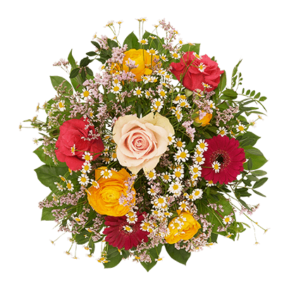 Rund gebundener Strauß in Violett-Rosa-Weiß mit Germini, Rosen, Limonium, Kamille und Ranunkeln. Als Beiwerk werden Pistazie und Salal verwendet.