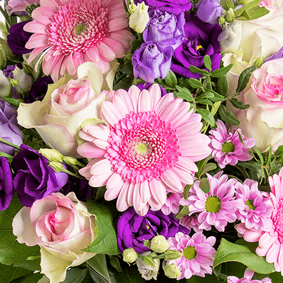 Zeigen Sie jemandem, dass Sie an sie denken: mit einem Blumengruß von Fleurop! Rund gebundener Strauß in Rosa und violetten Akzenten mit Germini, Rosen, Santini und Eustoma. Als Beiwerk werden Salal, Pistazie und Aralie verwendet.