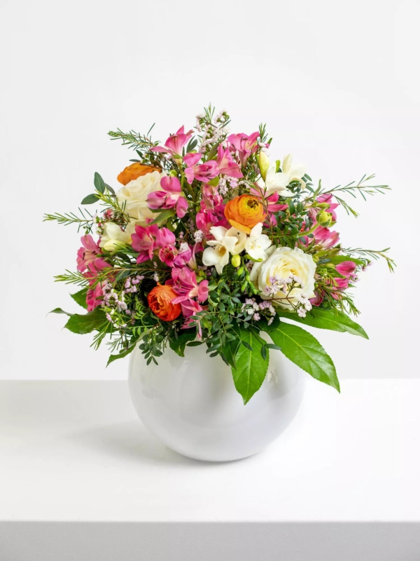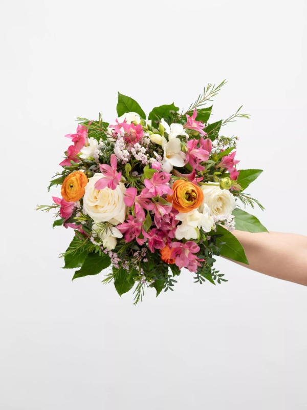 Rund gebundener Strauß in Rosa-Orange-Weiß mit Inkalilien (Alstroemeria), Freesien, Ranunkeln, Rosen und Waxflower. Als Beiwerk werden Pistazie und Aralie verwendet.