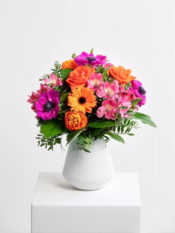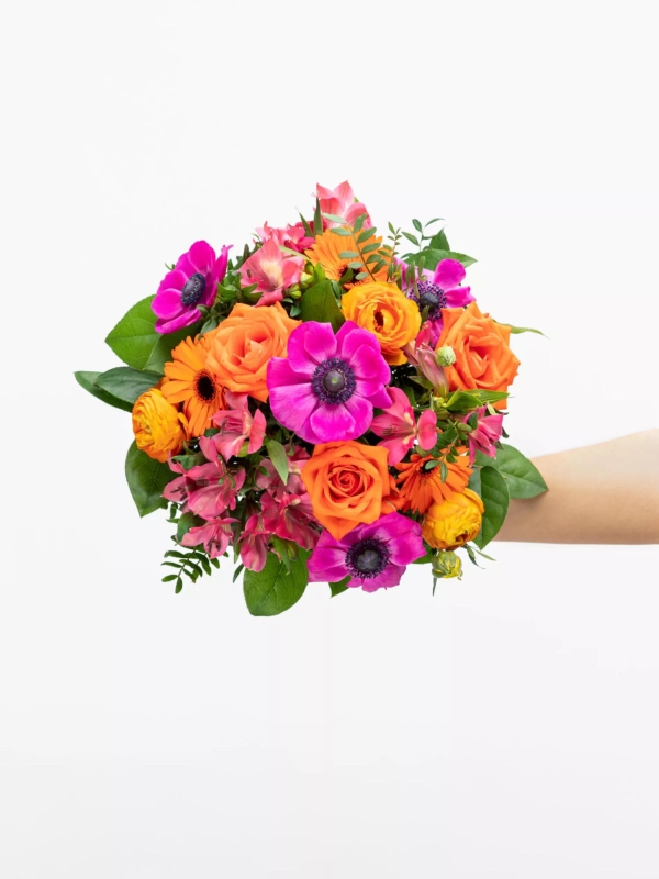 Rund gebundener Strauß in Orange-Pink mit Inkalilien (Alstroemeria), Anemonen, Germini, Rosen und Ranunkeln. Als Beiwerk werden Pistazie und Salal verwendet.