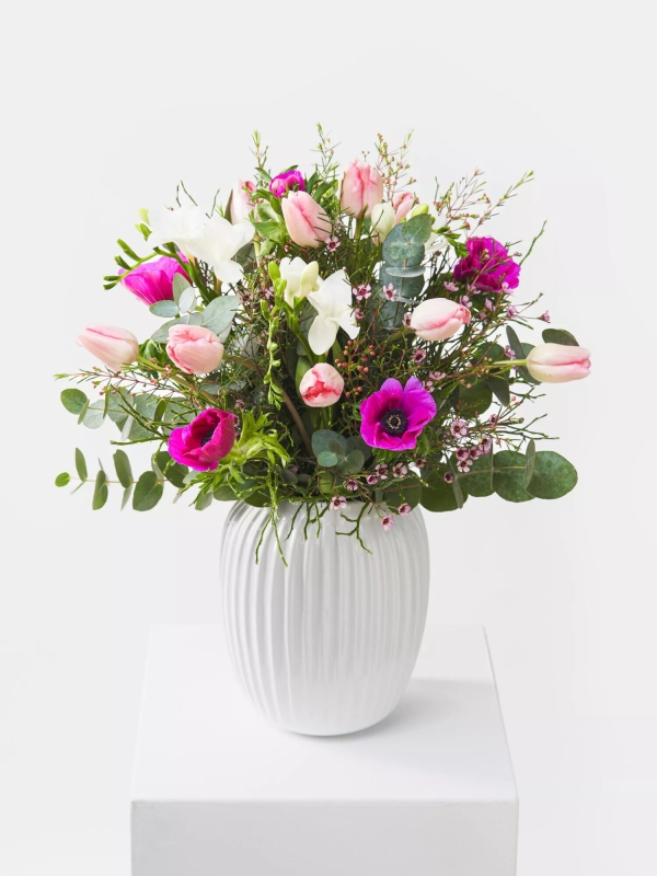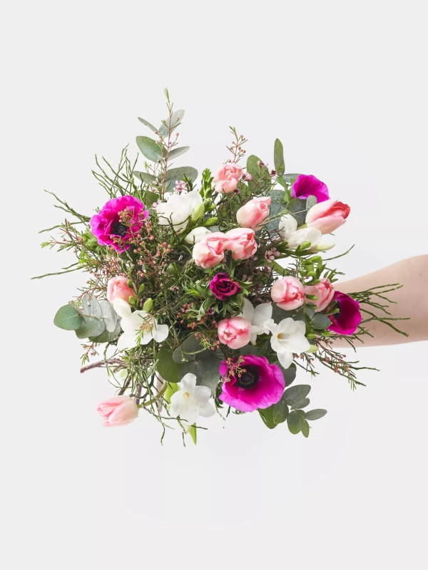 Verschenken Sie einen wunderschönen Frühlingsstrauß in zarten Farben. Aufgelockert gebundener Strauß in Weiß-Rosa-Pink mit Tulpen, Freesien, Anemonen, Waxflower, Heidelbeere und etwas Eukalyptus.