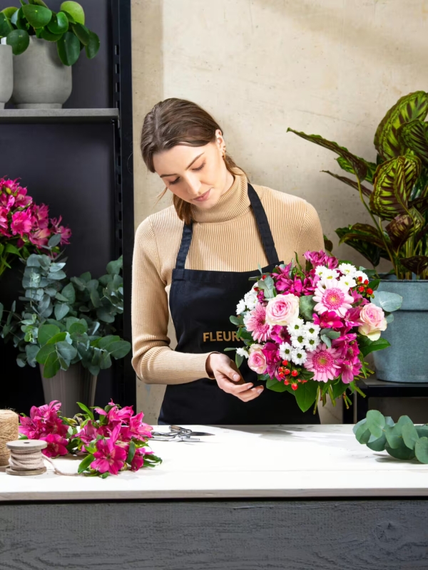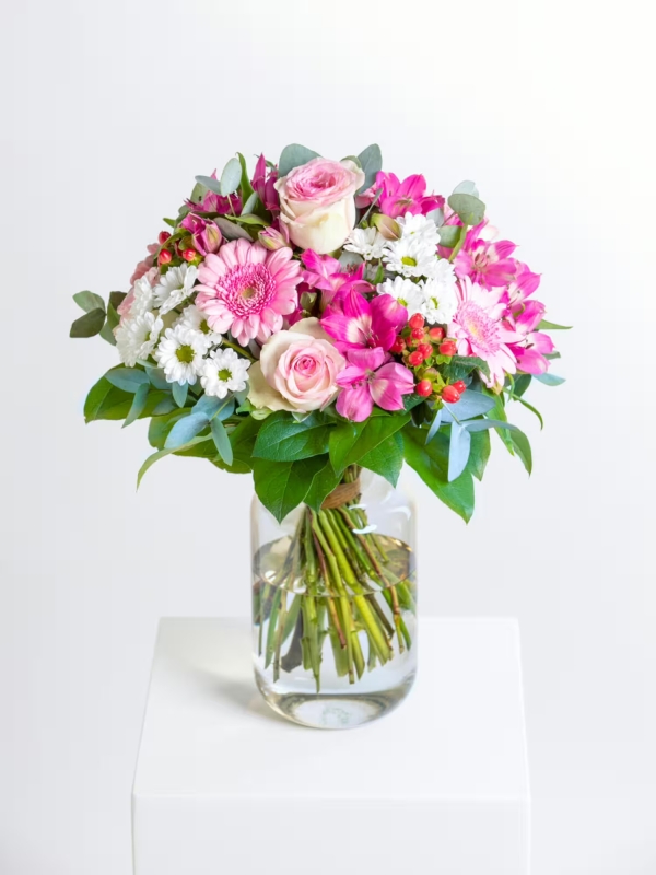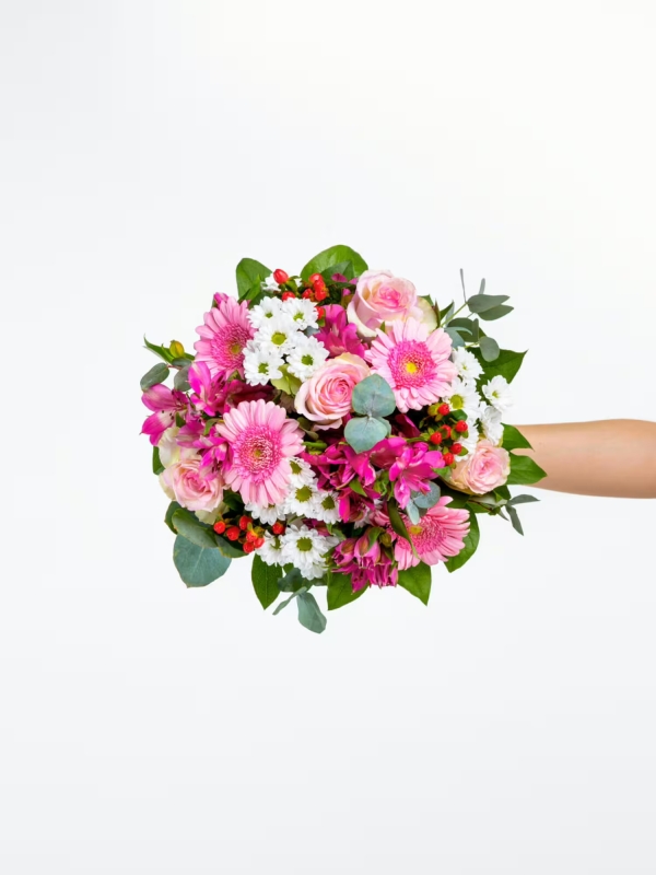 Überraschen Sie jemanden mit diesem liebevoll arrangierten Blumenstrauß. Rund gebundener Strauß in Weiß-Rosa-Pink mit Rosen, Santini, Gerbera, Inkalilien (Alstroemerien) und Hypericum. Als Beiwerk werden Eukalyptus und Salal verwendet.