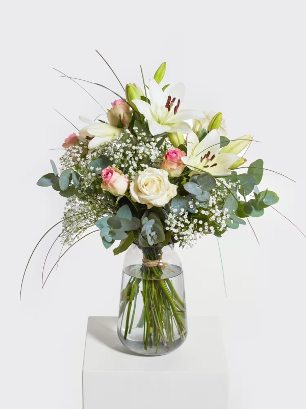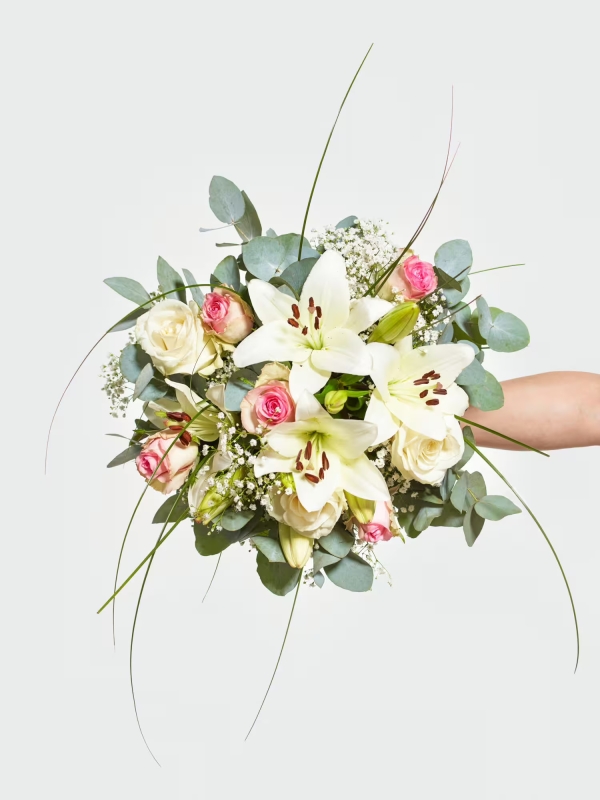 Der wunderschöne Blumenstrauß „Zarte Blütenträumerei“ ist ein Traum für alle Romantiker. Die zarten Rosen in Rosa-Weiß symbolisieren Liebe und Zärtlichkeit, die stark duftenden weißen Lilien stehen für Reinheit und Unschuld, während das Schleierkraut sowie die Eukalyptuszweige und das Bärgras für Frische und Leichtigkeit sorgen.