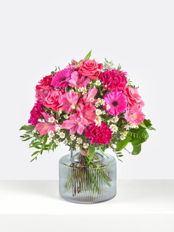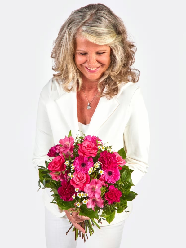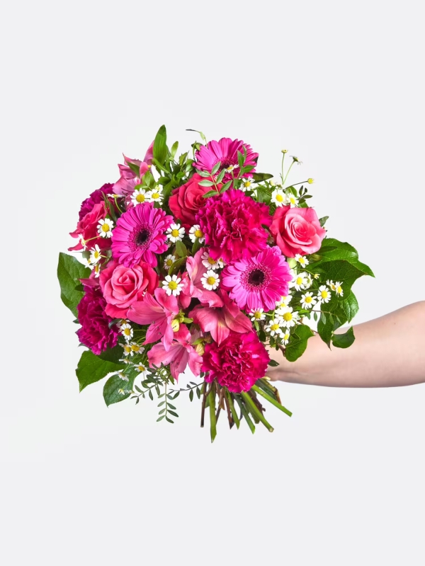 Der kompakt gebundene Strauß besticht durch seine harmonische Farbgebung in leuchtendem Pink mit zarten weißen Akzenten. Inkalilien, Nelken, Rosen, Germini und Kamille verschmelzen zu einem liebevoll abgestimmten Arrangement. Salal und Pistaziengrün verleihen dem Strauß eine frische, natürliche Note.