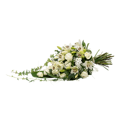 Lang gebundener Trauerstrauß in dezentem Weiß-Grün mit Rosen, Santini und Schleierkraut. Als Beiwerk werden Pistazie, Salal, Aralie, Chico, Efeu, Cordeline und Aspidistra verwendet.