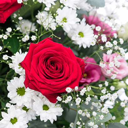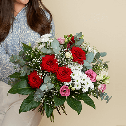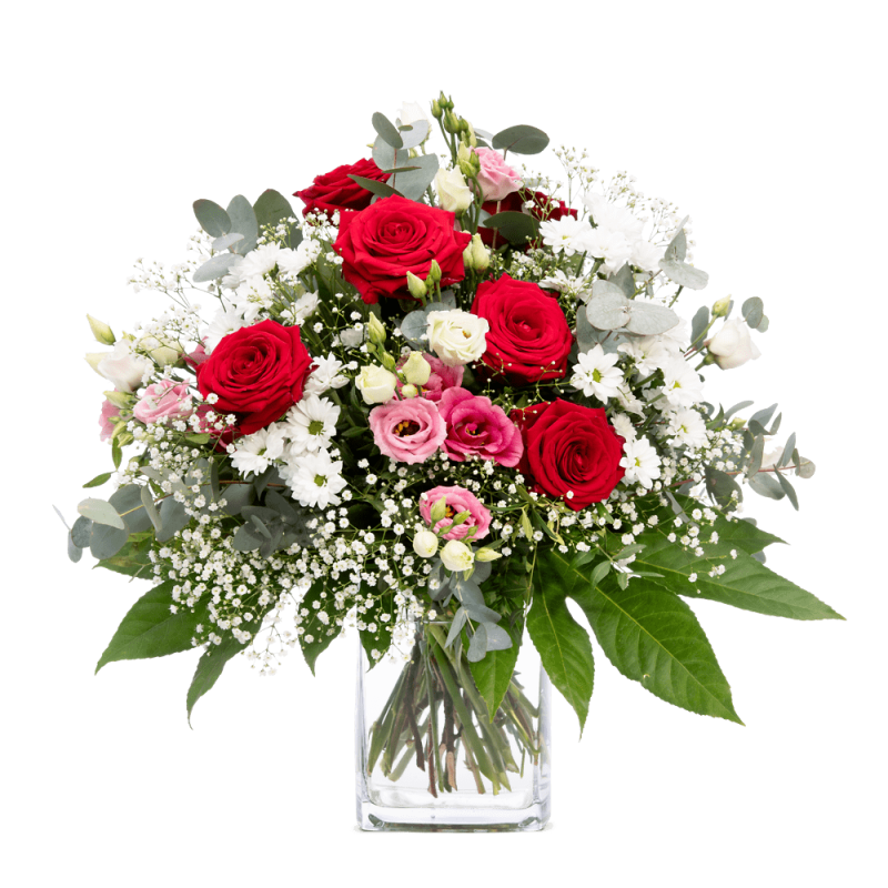 Machen Sie jemandem ein "Liebevolles Kompliment" - mit diesem lieblichen Strauß mit Rosen, Santini, Schleierkraut und Eustoma. Als Beiwerk werde, Eukalytpus, Pistazie und Aralie benutzt