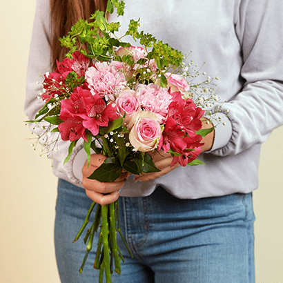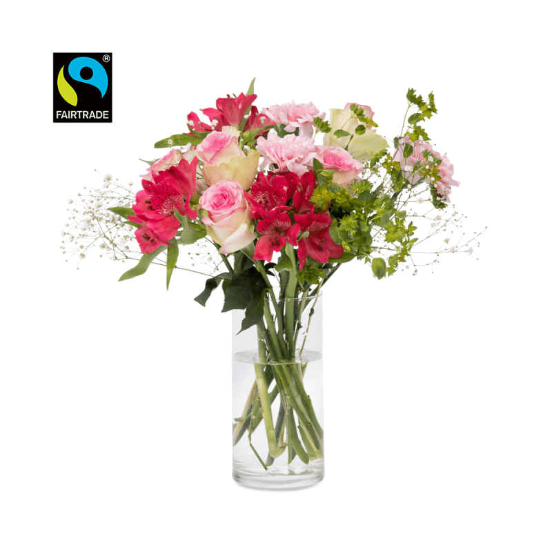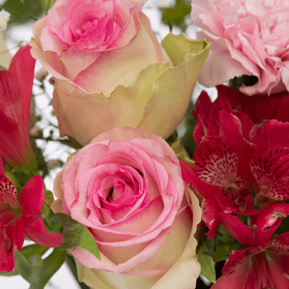 Ausgewählte Schnittblumen in Rosa und Pink, bestehend aus Rosen, Nelken und Alstromerien, die Sie in der Vase nach Belieben selbst arrangieren können. Als Beiwerk werden Schleierkraut und Bupleurum verwendet